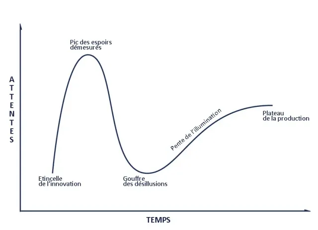Rien de bien “alarmant” me direz-vous : comme pour toute innovation, l’adoption est d’abord exponentielle puisque tout le monde se procure cette nouveauté pour la première fois (logique), puis on observe une stabilisation naturelle du marché avant de connaître une croissance plus mesurée, plus “saine”. La courbe de Gartner l’illustre bien :